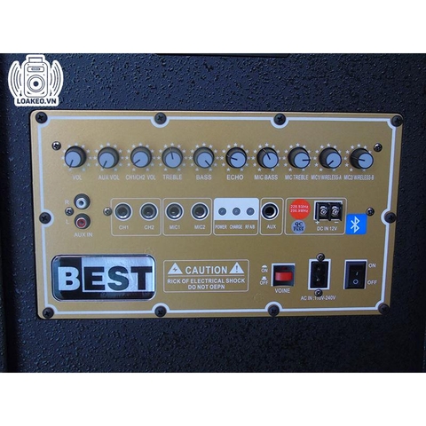 Bảng điểu chỉnh mang đậm chất Best, bề mặt được tráng một lớp kim loại ánh vàng sang trong, nổi bật giữ một nền đen huyên bí của chiếc loa cùng bộ nút cơ điều chỉnh âm lượng có thể điều chỉnh Echo, Delay, Volum Mic, Bass, Treble … cho phép người dùng tự điều chỉnh âm thanh phù hợp với chất giọng của mình, kết hợp với tiếng bass có đô sâu và tròn tuyệt vời, âm thanh được xử lí mượt mà trước khi cho ra thành phẩm. Thời gian sử dụng khá dài từ 5 đến 8 tiếng sử dụng tùy theo công suất lớn nhỏ mà người dùng nghe nhạc. Loa còn có cổng AUX-in cho phép kết nối với mội thiết bị hỗ trợ ngõ 3.5mm hay một loa kéo di động khác để có thể biến thành một dàn nhạc sống tại gia vô cùng tiên lợi và còn một ngõ tiện ích nữa đó chính là kết nối với bình Ắc Qui 12V để tiếp tục phát chơi nhạc thỏa thích khi hết điện mà không thể cắm sặc trực tiếp được như các bữa tiệc ngoài trời, những buổi dã ngoại, hay là trường hợp hi hưu như cúp điện, rất tiện dung.
