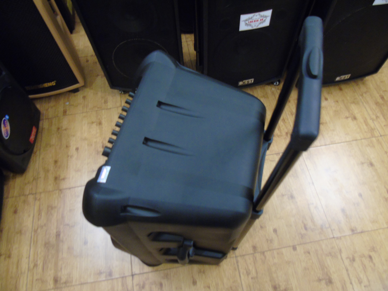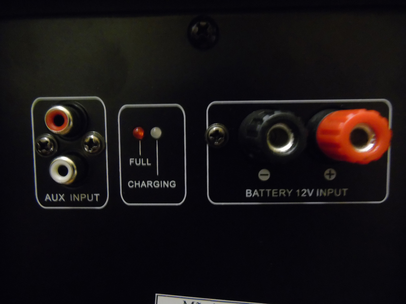 Mặt sau loa là cổng cắm dây AUX cho các thiết bị như TV để phát âm thanh qua loa. Đèn hiển thị hai chế độ đang sạc và đầy pin. Với thời lượng từ 6-8 tiếng cho một loa kéo di động mức giá tầm trung thế này đã đủ lâu để bạn vui chơi thỏa thích, bên cạnh đó còn được hỗ trợ thêm cắm bình ắc quy 12V cho cuộc vui của bạn trở nên bất tận.