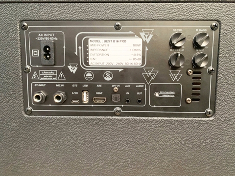 LOA XÁCH TAY DI ĐỘNG BEST B16 PRO Thông số kỹ thuật: Model: BEST B16PRO Phụ kiện: 2 micro không dây, 1 dây sạc Hệ thống loa : 2 bass – 1 mid – 1 treble Bass: 16 cm Treble: Có – Mid: Có Công suất tối đa : 350W Bluetooth: 5.0 – OTG LIVE USB/SD: Có – Optical – HDMI (ARC): Có In – Output: 3.5mm Micro – Guitar Input: 6.5 mm Kích thước loa: 48.5 x 28 x 28.5 cm Kích thước thùng: 56 x 36 x 39 cm Trọng lượng loa: 12.5 kg Trọng lượng thùng: 14 kg Màu sắc : Đen Thời lượng pin: 5...