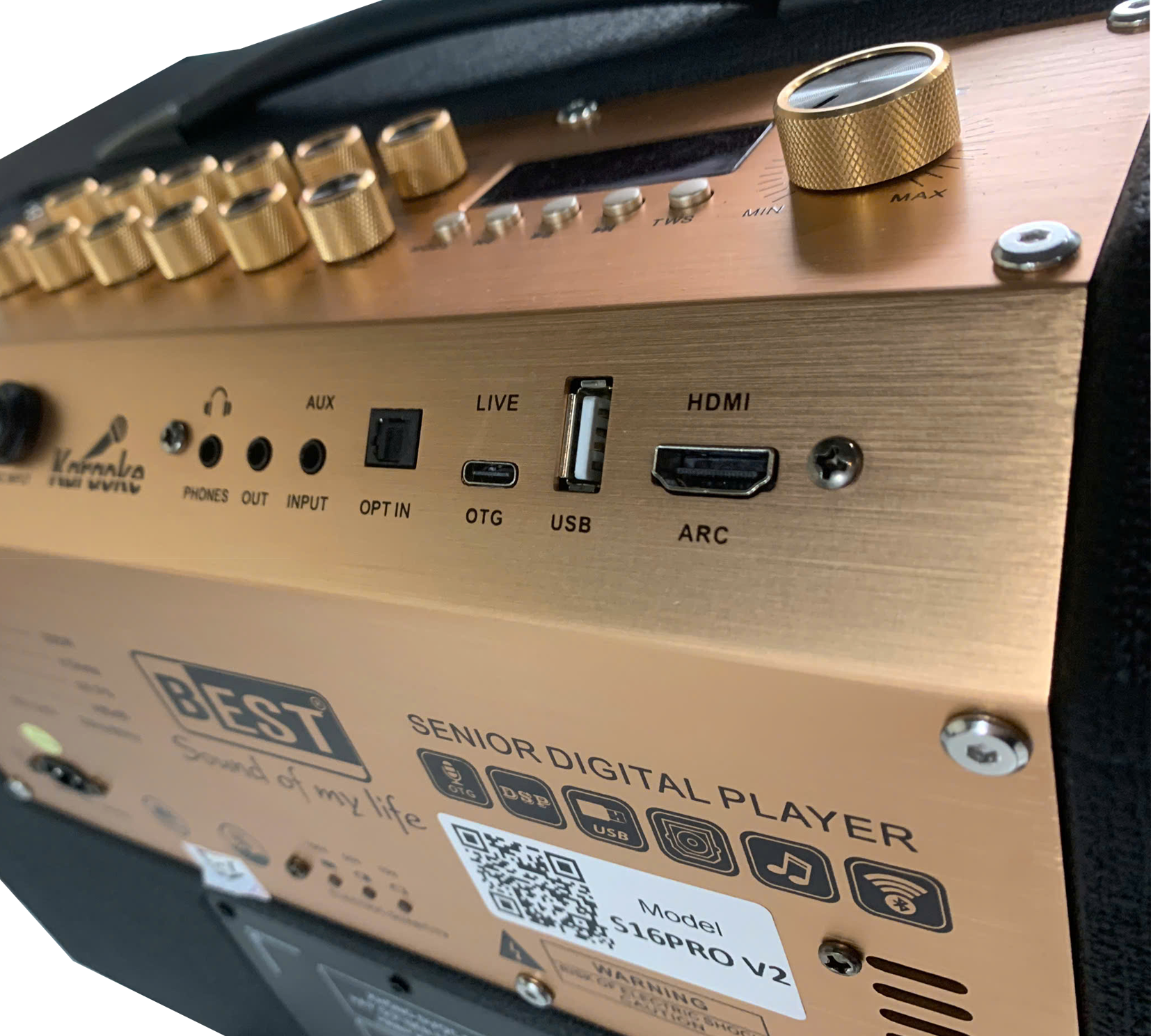 Đồng thời hỗ trợ nhiều kết nối không dây và có dây, bao gồm Bluetooth 5.0, AUX, USB, HDMI, cổng OTG, LINE IN và AUDIO OUT. Điều này cho phép bạn dễ dàng kết nối loa với nhiều thiết bị khác nhau như điện thoại, máy tính, TV,…